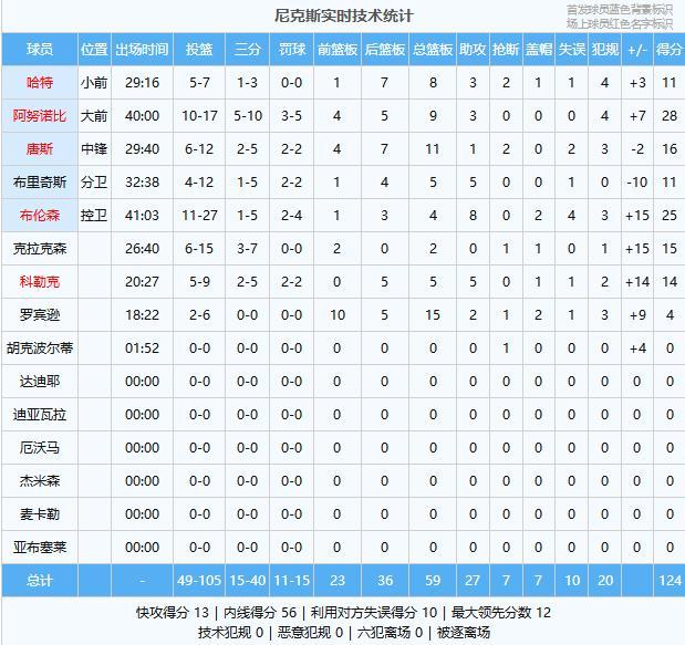 阿努诺比28分9板3助、布伦森25分4板8助2帽、唐斯16分11板1助2断、克拉克森15分2板、科勒克14分5板5助、哈特11分8板3助2断、布里奇斯11分5板5助、罗宾逊4分15板2助2帽