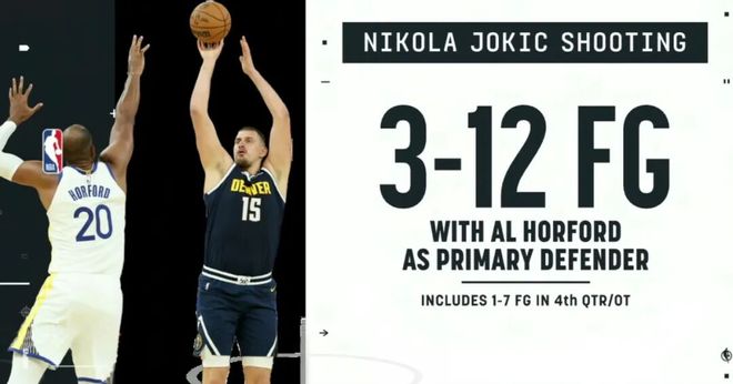除了进攻出色外,霍福德还作为主防人防得约基奇23投只得到21分——两人直接对位的32个回合,约基奇12中3,只得9分,其中第四节+加时赛,约基奇只有7投1中,完全被老伙夫防住了。