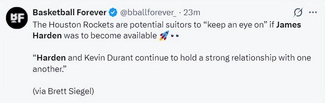 北京时间12月4日,NBA记者Brett Siegel报道,假如詹姆斯-哈登能被交易,那么休斯顿火箭队会是对他有兴趣的球队之一,因为哈登与杜兰特的关系十分牢固,不过火箭的薪资情况不太好,他们想要得到一位全明星后卫并不容易。