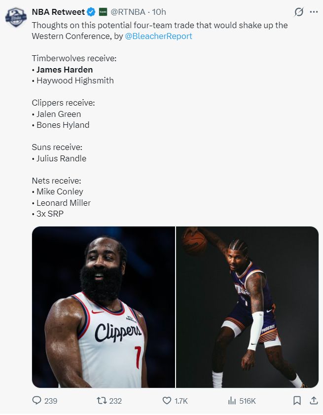 《露天看台》十小时前就为森林狼交易得到哈登进行了模拟,森林狼、快船、太阳、篮网四方大交易,森林狼得到哈登、海史密斯,快船得到杰伦-格林、海兰;太阳得到兰德尔,篮网得到康利、米勒、3个选秀权。