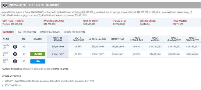 哈登本赛季的薪水为3918万,这份薪水如果火箭要单独交易他,配平难度其实较大,就算出范弗利特的2500万,都还有一千多万的缺口。