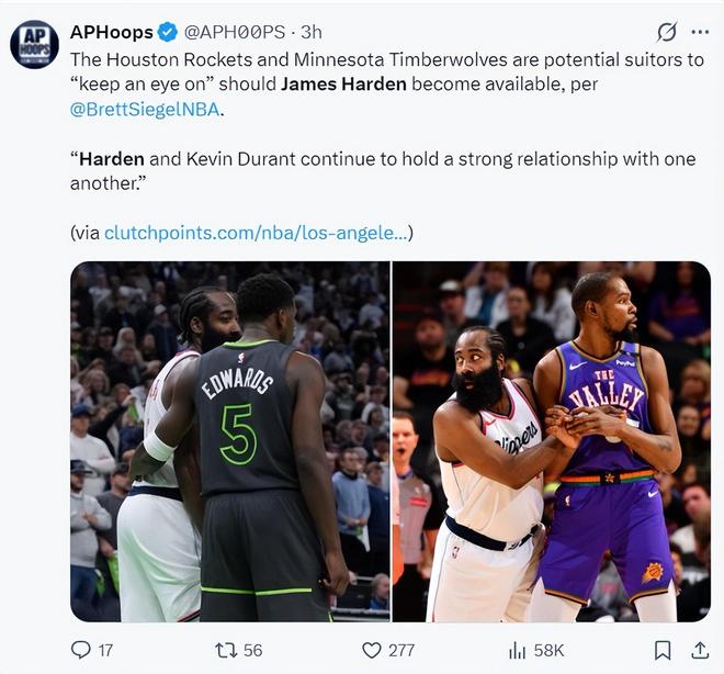 除了火箭队之外,明尼苏达森林狼也是密切关注哈登动向的球队,他们希望找到一位控球后卫来减压爱德华兹,但森林狼能拿出的筹码肯定不如火箭,这一点火箭是占据优势的。